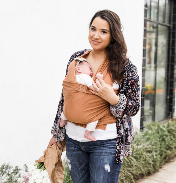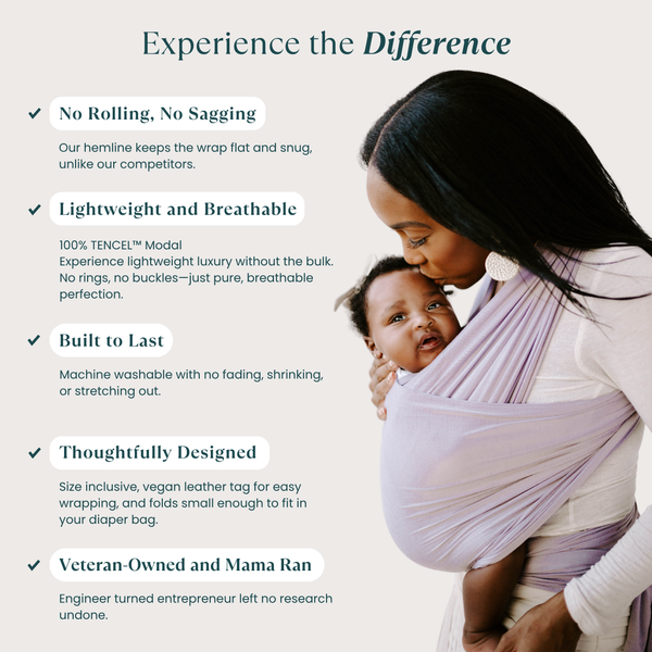 Our no-roll hemline and unique 2-way stretch (stretch for baby but stays snug around mama) makes it easier to put on and helps it stay in place for all day wearing. Beautiful rich colors, a vegan leather tag, and the perfect fit make our wrap not only functional but stylish.