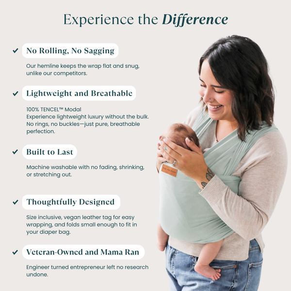 Our no-roll hemline and unique 2-way stretch (stretch for baby but stays snug around mama) makes it easier to put on and helps it stay in place for all day wearing. Beautiful rich colors, a vegan leather tag, and the perfect fit make our wrap not only functional but stylish.